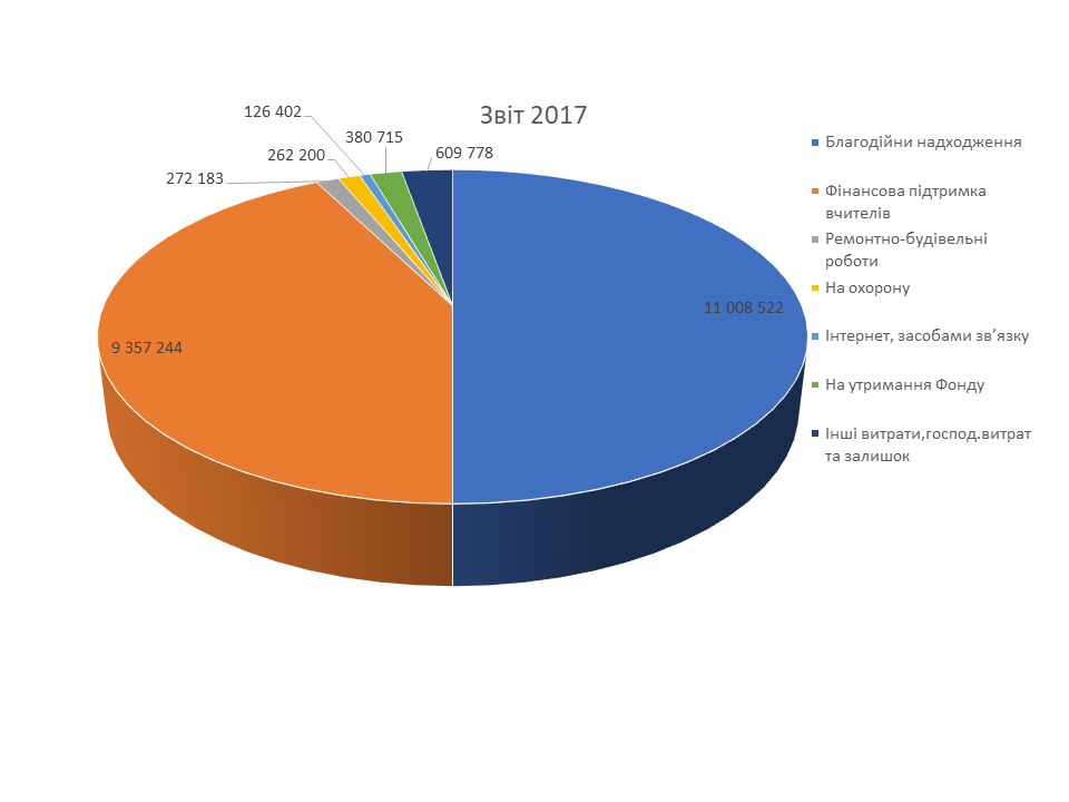 За звітний період надходження благодійних внесків становило 11 008 522 грн. Так у 2017 році більш ніж значна частина коштів, а саме 85 % від надходження благодійних внесків, пішла на забезпечення фінансової підтримки вчительства, вихователів та адміністративно-господарського персоналу.