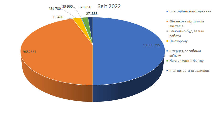 За звітний період надходження благодійних внесків становить 10 830 295 грн. У 2022 році значна частина коштів, а саме 89 % від надходження благодійних внесків, пішла на забезпечення фінансової підтримки вчителів, вихователів та адміністративно-господарського персоналу.